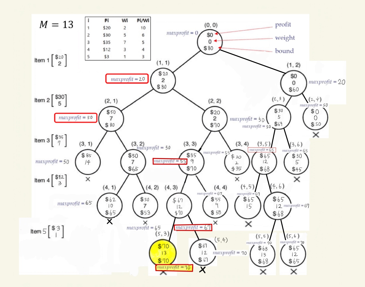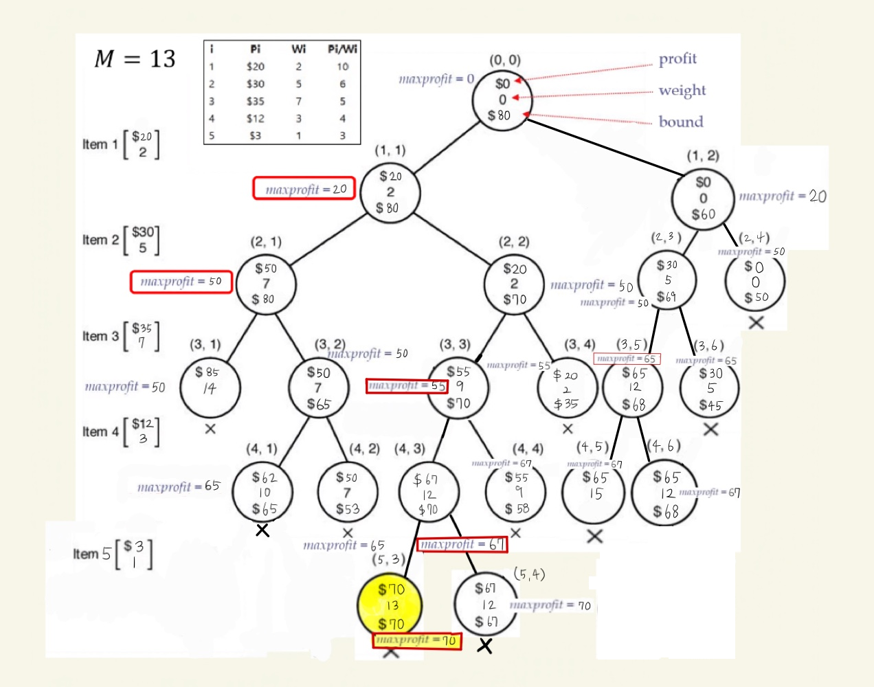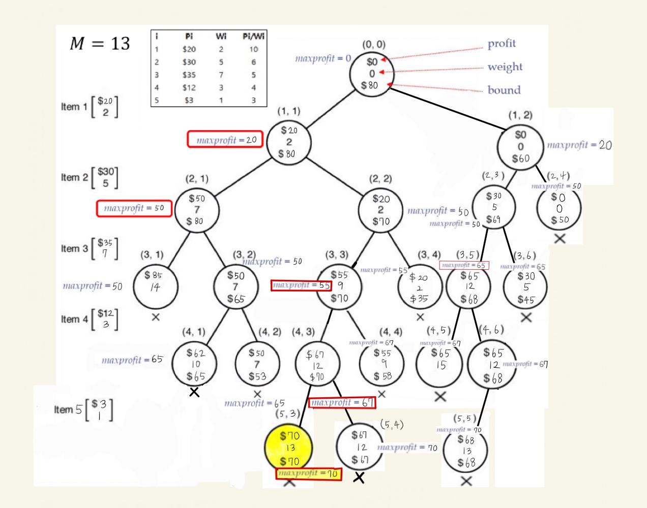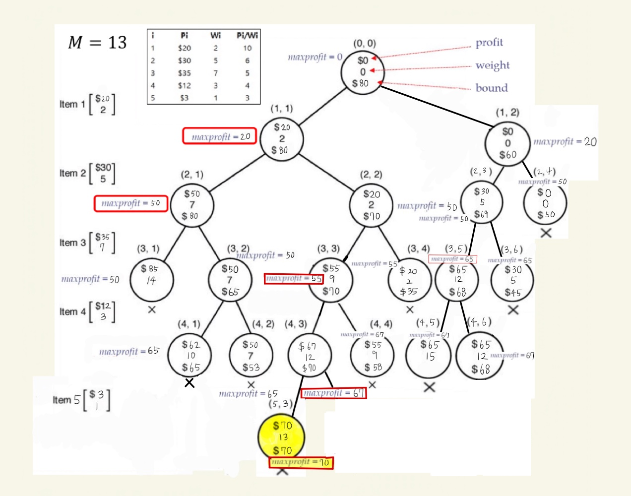 1. (5,3)에서 profit = 70, weight = 13 이고, maxprofit 은 70입니다.