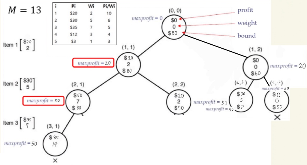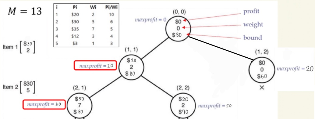 3. (weight < M) && (bound > maxprofit) 이면, 유망하다고 보고 가지를 뻗어나갑니다.