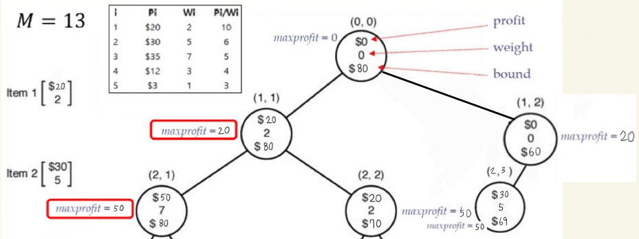 1. (2,3)에서 profit = 30, weight = 5 이고, maxprofit 은 (2,1)에서 구한 50입니다.