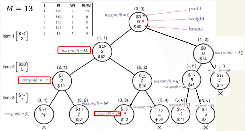 1. (3,5)에서 profit = 65, weight = 12 이고, maxprofit 은 65입니다.