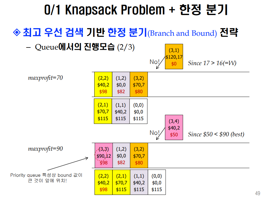 강의교안에서 knapsack problem 최고 우선 검색으로 풀어내는 과정 중