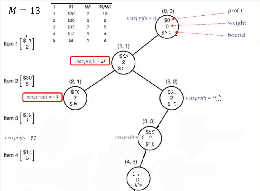 1. (5,3)에서 profit = 70, weight = 13 이고, maxprofit 은 70입니다.