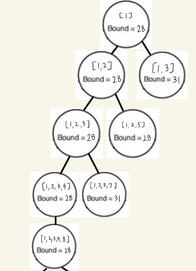 - 이 문제에서는 주어진 노드에서 뻗어 나가서 얻을 수 있는 여행경로 길이의 하한(최소치, lower bound)을 구하여 한계치로 한다.