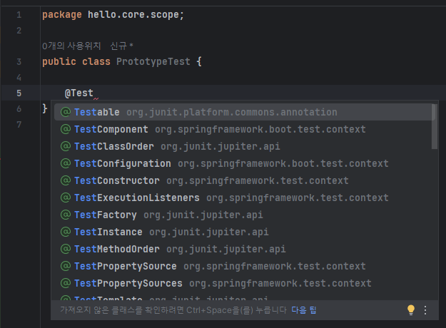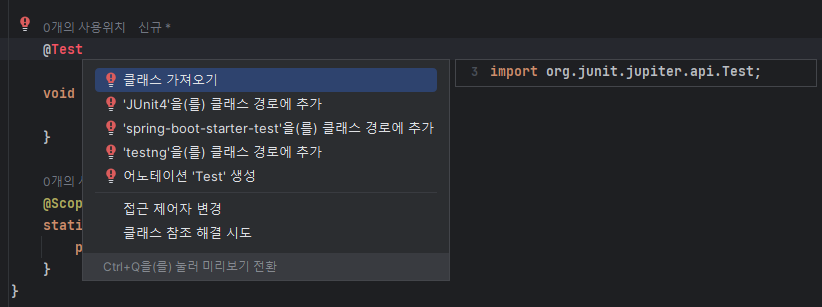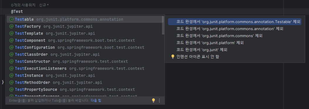 나도 평소처럼 스터디를 하다가 갑자기 잘 사용해오던 org.junit.jupiter.api.Test 가 자동완성 탭에서 사라졌다.