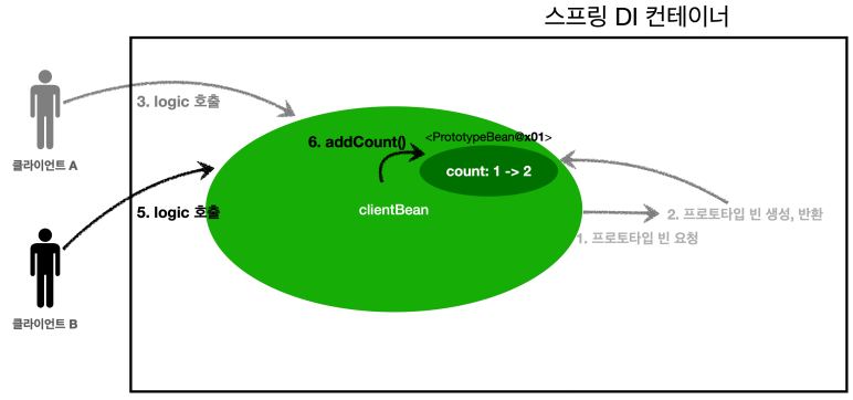 참고: 여러 빈에서 같은 프로토타입 빈을 주입 받으면, 주입 받는 시점에 각각 새로운 프로토타입 빈이 생성된다. 예를 들어서 clientA, clientB가 각각 의존관계 주입을 받으면 각각 다른 인스턴스의 프로토타입 빈을 주입 받는다.