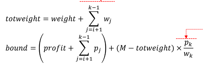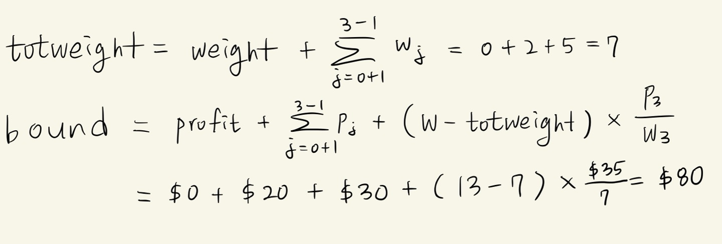 2 + 5 + 7 = 14 이고, 14 > 13(W의 값)이므로, 3번째 아이템을 취하면 무게의 합이 W를 넘습니다. 따라서 k = 3 이고, totweight 와 bound 는 다음과 같이 계산합니다.