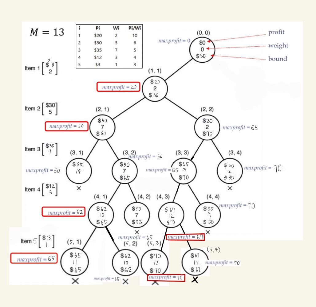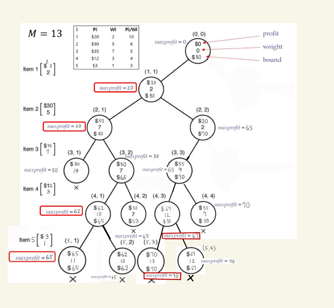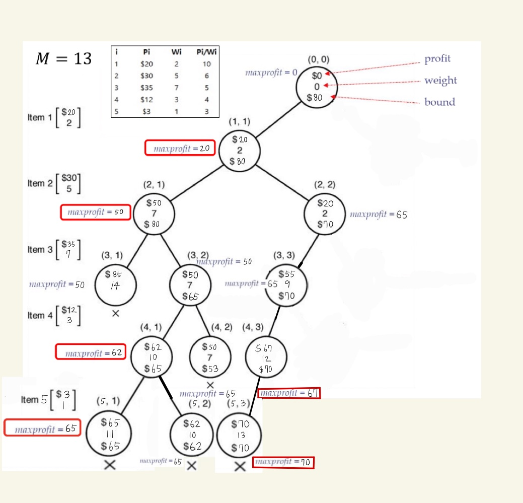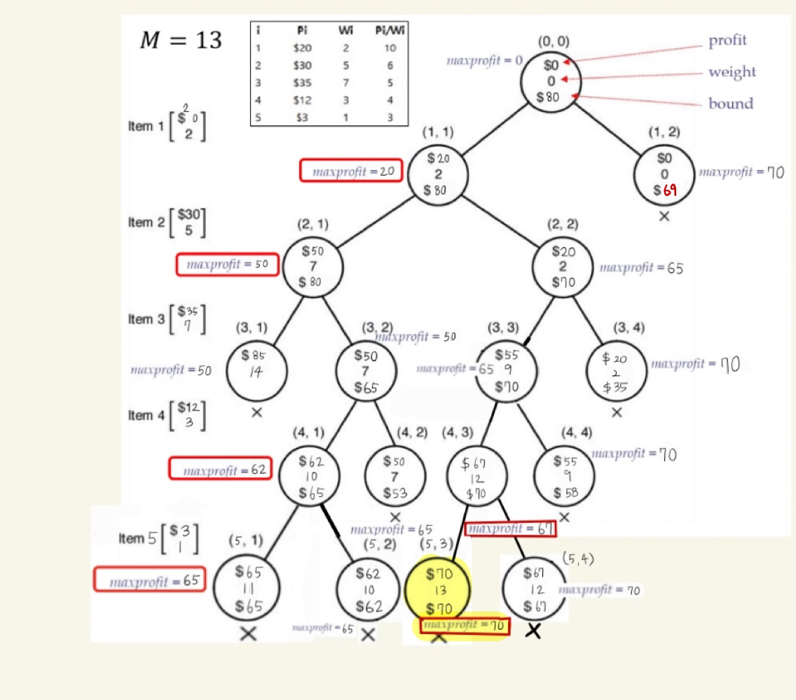 1. (5,3)에서 profit = 70, weight = 13 이고, maxprofit 은 70입니다.