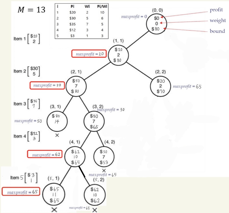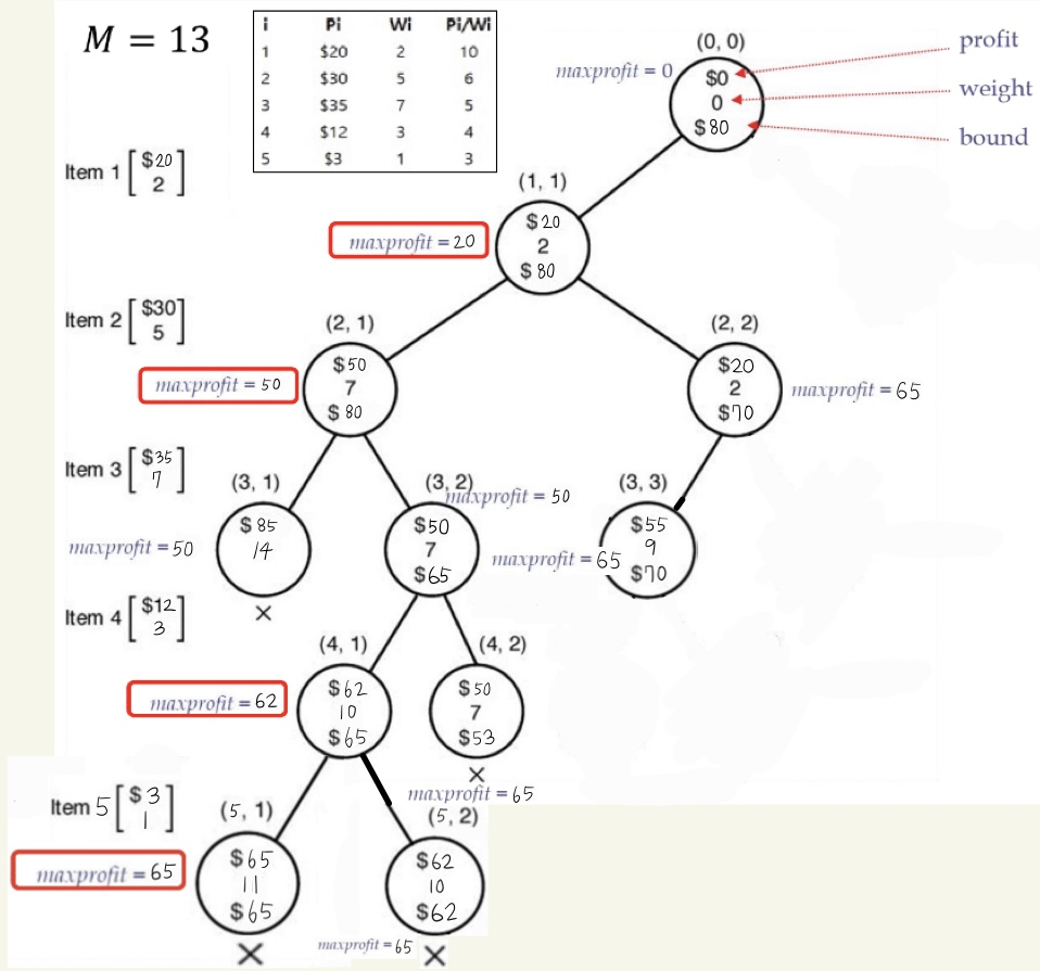 1. (3,1)에서 profit = 85, weight = 14 입니다. M = 13 < weight = 14 이므로 무게를 초과하였습니다.