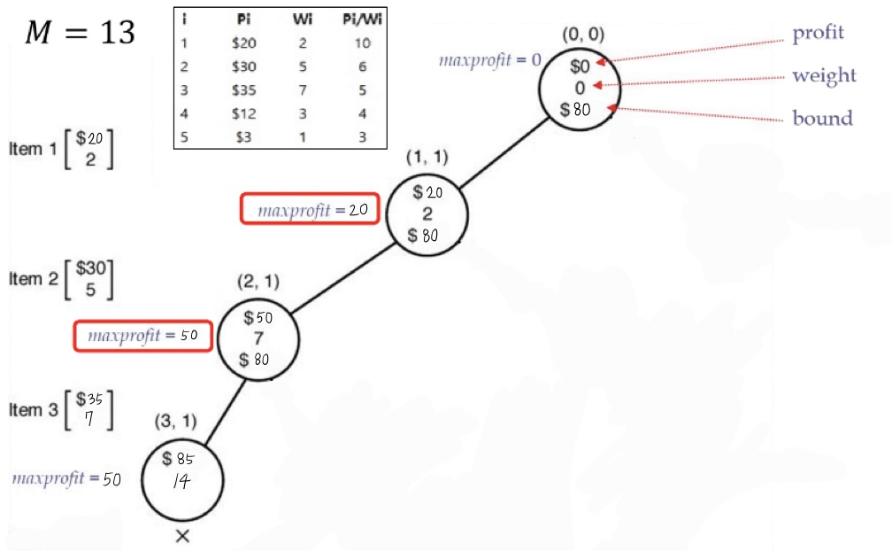 3) (weight < M) && (bound > maxprofit) 이면, 유망하다고 보고 가지를 뻗어나갑니다.