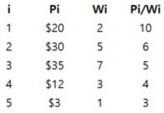 0-1 Knapsack Problem에서 배낭의 한계 무게가 13 (즉 𝑀 = 13)이고, 보석 아이템이 아래 표와 같이 주어질 때, 깊이 우선 검색을 사용한 한정 분기(Branch and Bound)에 대한 상태 공간 트리를 제시하고, 상태 공간 트리 내에서 방문한 전체 노드 수를 비교하시오.